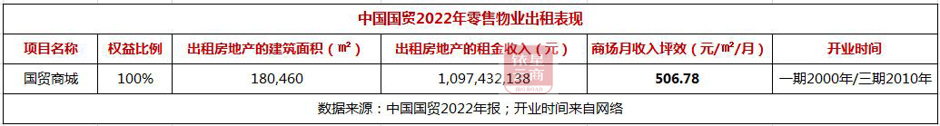 中国国贸2022年度报告显示,中国国际贸易中心综合体中的零售商场——国贸商城2022年出租物业的建筑面积为180,460平方米,出租房地产的租金收入为1,097,432,138元。