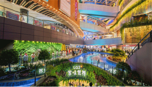具体来看,南京鹏欣水游城在中庭周围的柱子、天花板和地面上安装了LED屏幕,此处的光影可与消费者产生互动,还能结合光影、声音和喷泉交织出虚拟现实融合情景,为消费者提供沉浸式水岸氛围。其外立面,也增设了垂直绿化和以瀑布为灵感的LED屏幕,更具视觉冲击的消费环境以及创意内容,大大提高了商圈活力。