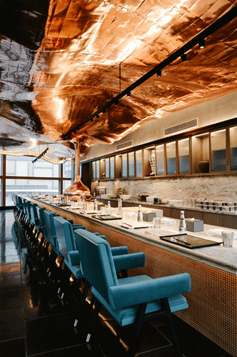 天燚·天妇罗 从一进店,就被金灿灿,由手工打造而成的全铜天花惊住了,让消费者从入门就能体验到深圳天燚的整体空间设计感,机锤弧形铜板大门配合大厅中央波纹紫铜吊顶尽显大气奢华,还有处于中心的紫铜天妇罗操作区视觉锤,由拿下无数亚洲设计奖项的新加坡国际团队操刀设计。大厅的设计更是能让每一位来品尝的顾客零距离感受厨师制作天妇罗的过程。