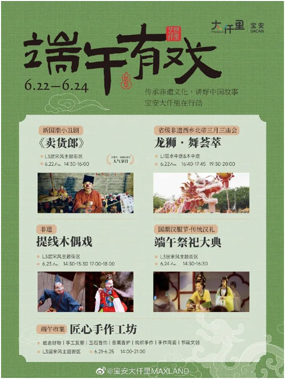 不同于华侨城商管旗下三大项目,深圳宝安大仟里将开展《端午有戏》主题活动,宝安大仟里 x 西乡庙会、非遗·舞龙舞狮、新国潮小丑剧《卖货郎》、非遗·提线木偶戏、端午祭祀大典、端午市集·匠心手作工坊等系列活动将在这里轮番呈现;深业上城则携手NEED!FLEA以及来自全国各地80位摊开启“市集攻略”;中航城君尚购物中心将举办《千里江山,只此青绿》《梦回敦煌,穿越千年》《大唐盛世,唐宫盛宴》三场爆款舞蹈。