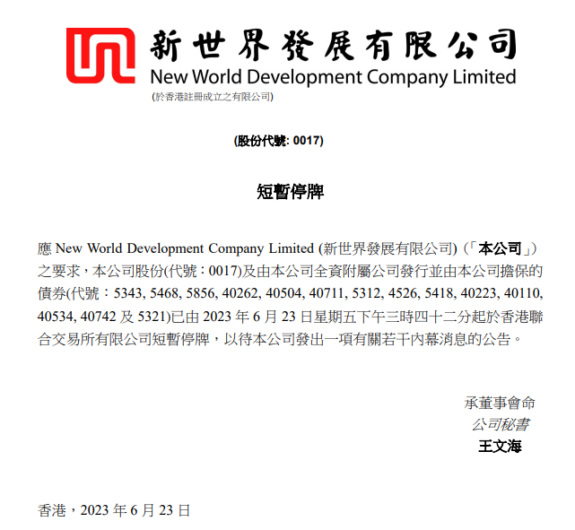 而当日午间,新世界发展旗下多元产业上市旗舰新创建集团有限公司亦发布公告,称该公司股份将于2023年6月23日下午1时05分起短暂停止买卖,以待公司刊发有关内幕消息的公告。