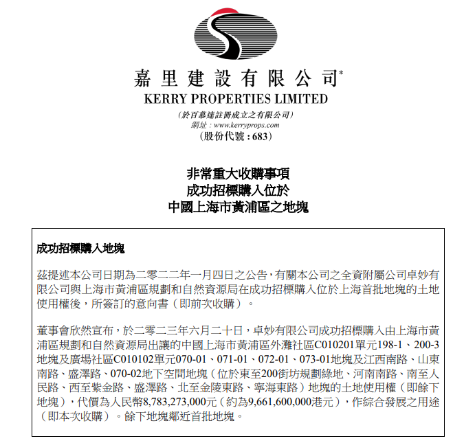 6月20日,嘉里建设有限公司发布公告称,全资附属公司成功卓妙有限公司招标购入位于上海市黄浦的地块。嘉里建设称,该项目(首批地块及余下地块)为一个以交通导向的综合用途发展项目,将包括住宅、办公楼、零售和酒店用途的房地产,以城市化和历史修复整体设计为规划。根据目前的规划,首批地块将主要用作住宅公寓和石库门联排别墅,以及办公楼、零售和酒店,建筑面积约为198,500平方米。余下地块将主要包括办公楼和零售用途,将产生建筑面积约308,000平方米。当合并完成后,该项目(首批地块及余下地块)可提供最大允许建筑面积约506,500平方米,须获得设计及政府规划审批和施工审批。