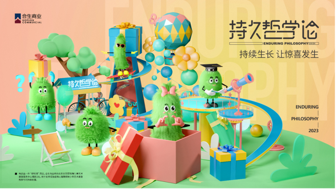 不同于上海兴业太古汇,合生商业更是动员旗下各大项目,发起一系列“持久哲学论——持续生长,让惊喜发生”的主题公益行动。今年6月,以“关注人生与成长”为核心内涵,合生商业联合金羽翼残障儿童艺术康复中心共同发起了一场公益倡导,邀请金羽翼的小学员们借助绿毛怪形象,用画笔描绘出自己向往的图景。