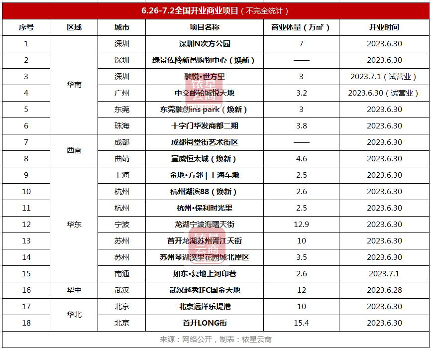 暑期营销季即将开启,本周迎商业项目开业小高峰,据铱星云商不完全统计,6月28日至7月1日,全国5个区域13城迎来约18个项目开业,包括华南区的6个项目:深圳N次方公园、绿景佐阾新邑购物中心、融悦·世方里(试营业)、广州中交邮轮城悦天地、东莞融创ins park、珠海十字门华发商都二期;西南地区的成都祠堂街艺术街区、曲靖宣威恒太城;华东区的金地·方邻 | 上海车墩、杭州湖滨88、杭州·保利时光里、龙湖宁波海曙天街、首开龙湖苏州胥江天街、苏州琴湖溪里花园城北岸区、南通如东·复地上河印巷等7个项目;华中的武汉越秀IFC国金天地;北京的远洋乐堤港、首开LONG街等。