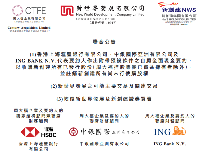 6月27日,新世界发展及新创建集团联合公布,周大福企业提出以每股9.15元收购尚未实益持有之新创建全部已发行股份,较新创建停牌前收市价7.99元溢价14.5%。