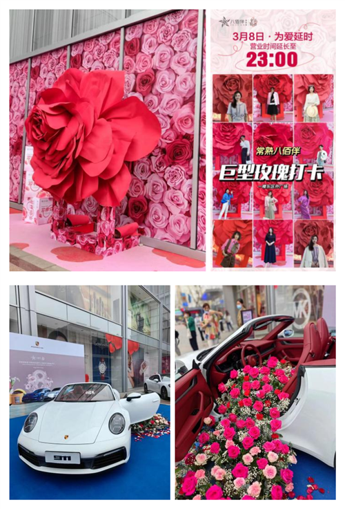 巨型花束、大花美陈、巨型玫瑰等网红打卡点给人超强的视觉冲击和惊喜,打造体验感与具有话题传播性的全新消费场景。定期策划多样化的营销活动,与常熟保时捷中心等品牌开展异业&场内联动,成功刺激了消费并带动客流的增长。
