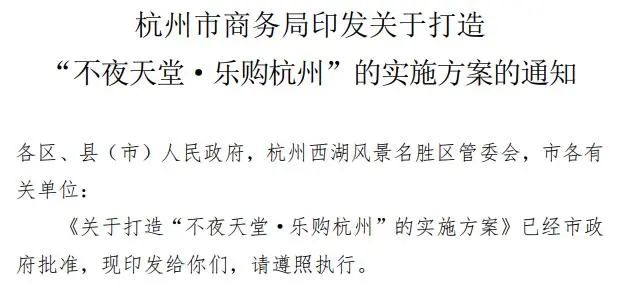 6月29日,杭州市商务局近日正式印发《关于打造“不夜天堂·乐购杭州”的实施方案》。通知明确,方案将于2023年7月22日起施行,为期三年。