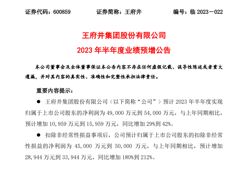 20.王府井集团股份有限公司发布2023年半年度业绩预增公告