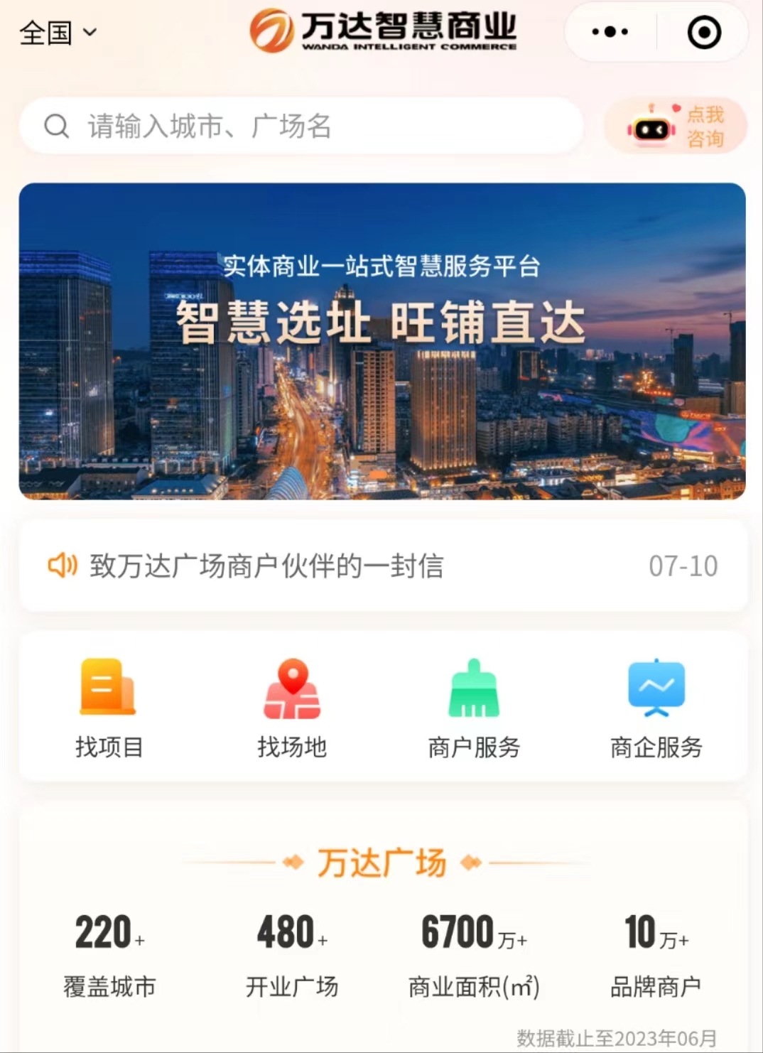 今日(7月10日),据“万达智慧商业”公众号发布推文显示,万达商管集团宣布上线万达智慧商业平台。据悉,该平台的服务模式覆盖到全国近500座万达广场,涉及商户选址、租铺、开店、经营四类场景,致力于为商户提供一体化的商业增值服务。据万达智慧商业平台显示,截至2023年6月,万达广场已达超480家,覆盖超220个城市,总商业面积超6700万平方米,合作品牌商户超10万个。