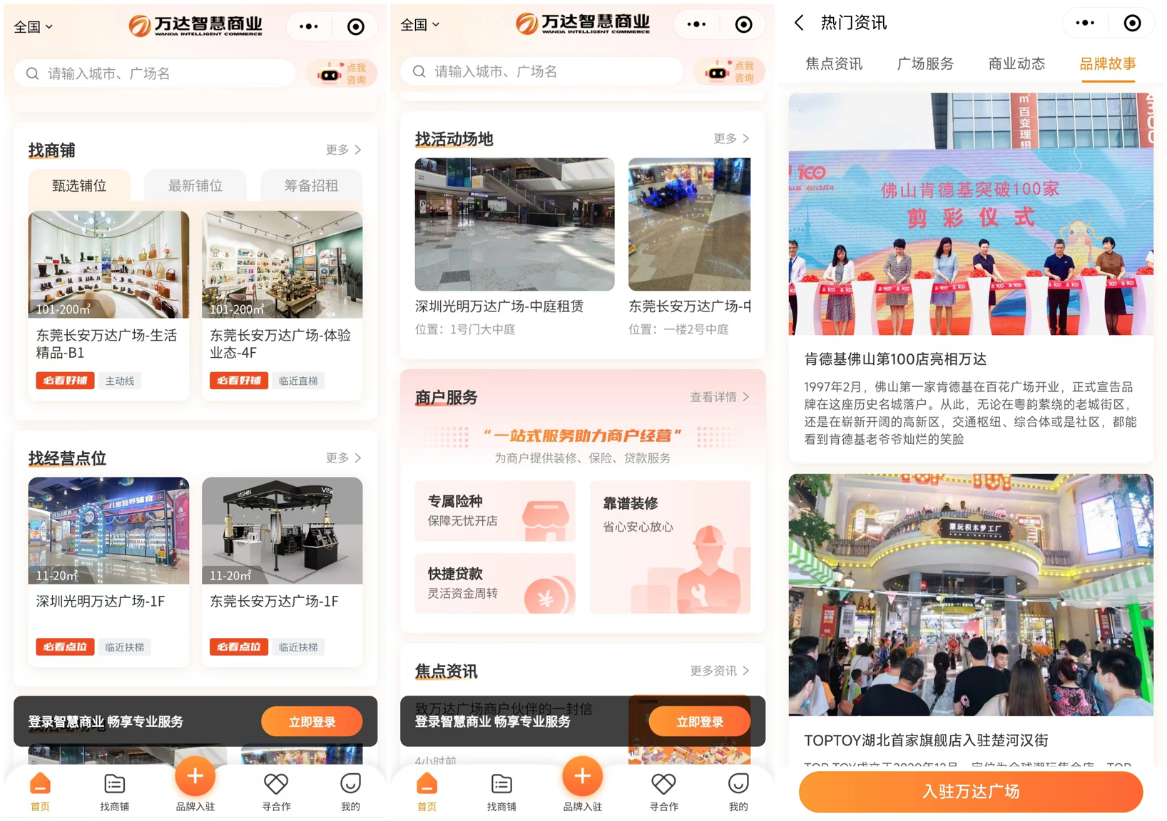 在“万达智慧商业”小程序上,首页分为“找项目”、“找场地”、“商户服务”、“商企服务”四大板块。值得一提的是,该平台实时推出万达广场相关资讯,商户可在上方了解到各项目举办的营销内容、各品牌故事等内容,助力商户决策选址。
