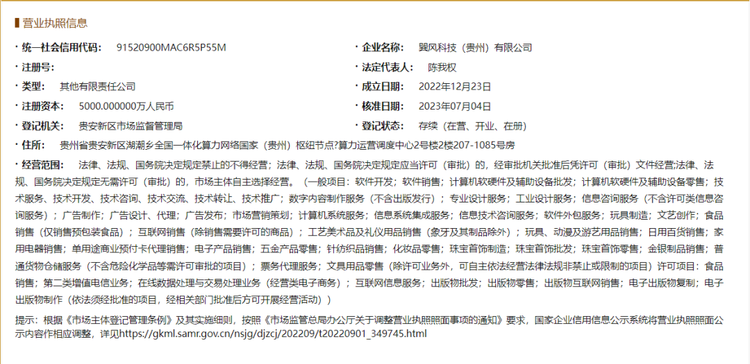 据了解,巽风科技有限公司于2022年12月成立,注册资本5000万人名币,法定代表人为陈我权,由中国贵州茅台酒厂文化旅游有限责任公司持股51%、网易好物科技有限公司持股49%。