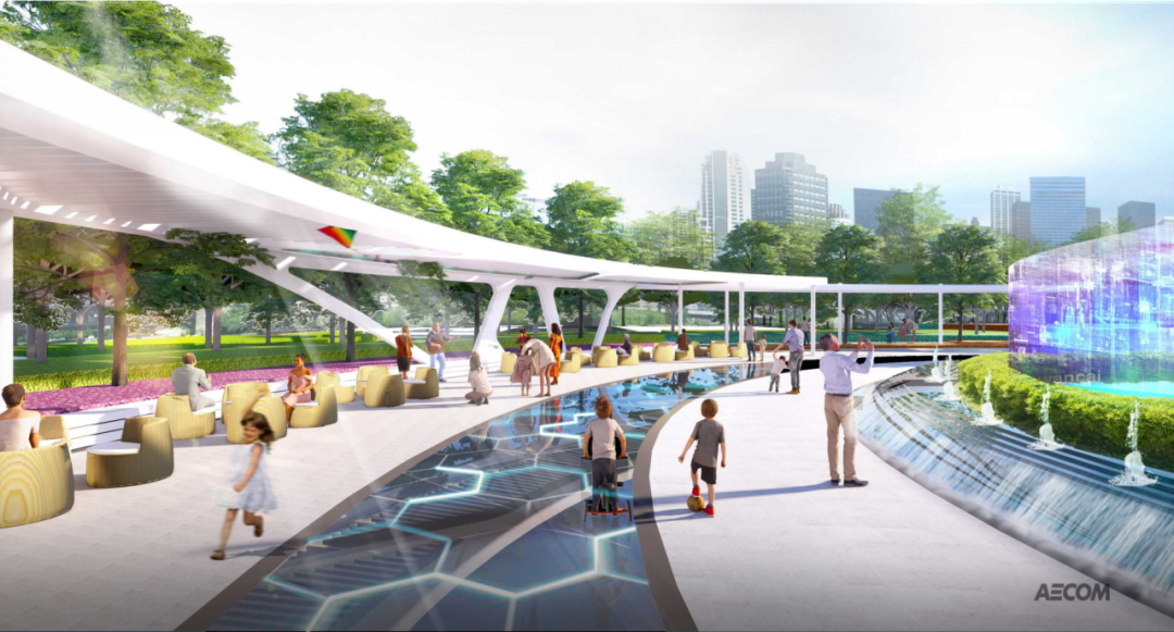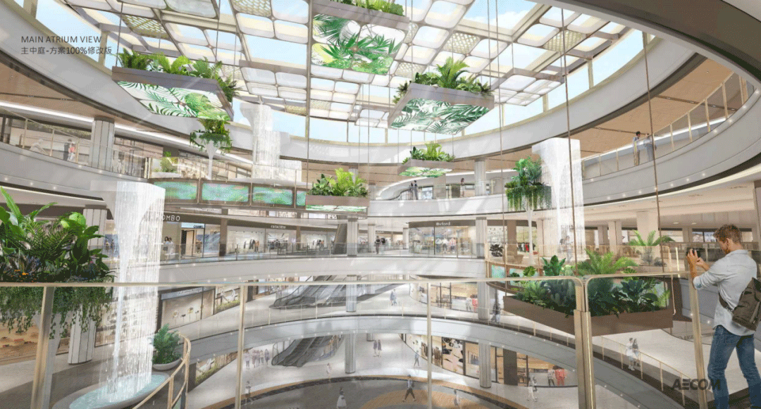 海雅缤纷天地由国际知名建筑设计公司美国ARQ、RTKL、AECOM设计事务所联袂担纲设计,以“都市中的度假慢生活”为核心设计理念,通过景观的蔓延流动将这一概念注入整个商场建筑设计之中。在空间入口处利用水体、绿植与空间层级的流动,完成内外部快慢节奏的起承转合。在商场内部,打造垂直森林,中庭错落的绿植平台与电子水幕,以及半空中的悬浮树池,营造出超现实的未来感。设计师团队别出心裁打造了约1.8万方屋顶花园景观,绿植树池、休憩廊架、喷泉草阶……暗藏巧思的景观与设施组合,打造出超多玩法的主题区域。绿植与水流构建的自然景观,共同打造出由城市一秒穿越度假丛林的奇妙感官,让人们感受慢节奏,沉浸慢生活。
