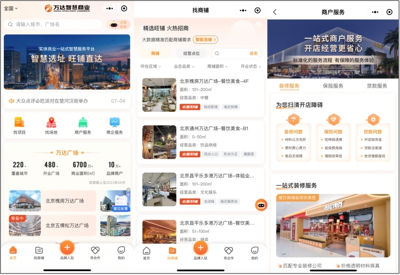 商户可以通过万达智慧商业平台实时连接全国万达广场的各类空间资源和服务资源。在选址和租铺方面,万达商管将全国近500座万达广场优质铺位及经营点位、活动场地等搬到了线上,用户可以通过万达智慧商业平台便捷搜索全国万达广场的各类空间资源,并实时联系服务顾问进行咨询。借助AI和大数据分析能力,平台能够快速匹配适合的铺位,无论是新品牌首店还是老商户拓展新店,都能轻松找到理想的铺位。这种融合了“AI智能+专家顾问”的服务模式,将理性的数据智能与有温度的人工服务相结合,成为服务升级的亮点。在开店和经营方面,除了常规的营运服务和营销帮扶,万达商管还通过严格筛选符合“万达标准”的高品质装修公司、国内头部保险公司等生态合作伙伴,创新推出商铺装修、商户保险、商户人才服务等一体化增值服务。为商户创建完整的服务通道和标准化服务流程,确保商户开店经营更加安心。