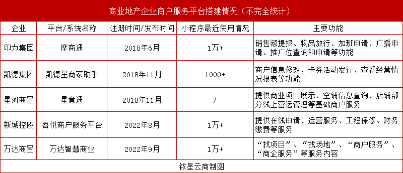 据铱星云商不完全统计,印力、凯德星河、星河、新城、万达等商业地产企业均有自行开发为商户提供服务的平台或系统。