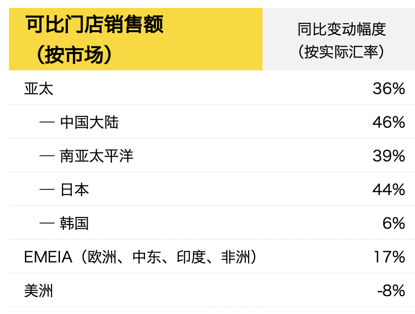 同时,包括英国在内的欧洲、非洲和中东大区可比门店收入增长17%,主要由游客驱动;美洲市场销售额下跌8%,但本土市场下滑的业绩一定程度上被美洲游客在其它国家的消费弥补。