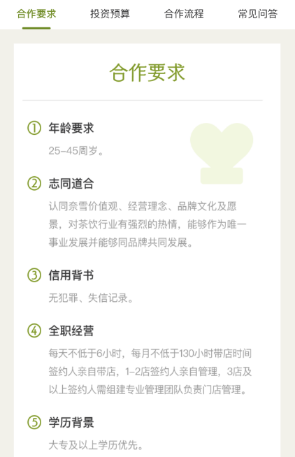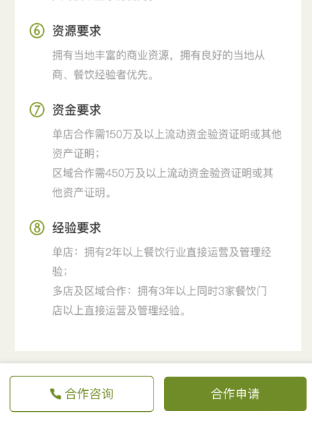 目前,通过奈雪官方公众号及点单小程序均可进入“奈雪的茶合伙人”申请入口,可以清楚地看到奈雪对于意向合伙人的资质要求、投资预算以及申请流程。 在奈雪公布的细则中,在资金要求方面,分“单店合作”和“区域合作”两大类,其中,单店合作需150万以上流动资金验资证明或其他资产证明;区域合作需450万及以上流动资金证明或其他资产证明。而对于门店面积的要求明确限定在90-170平的范围。