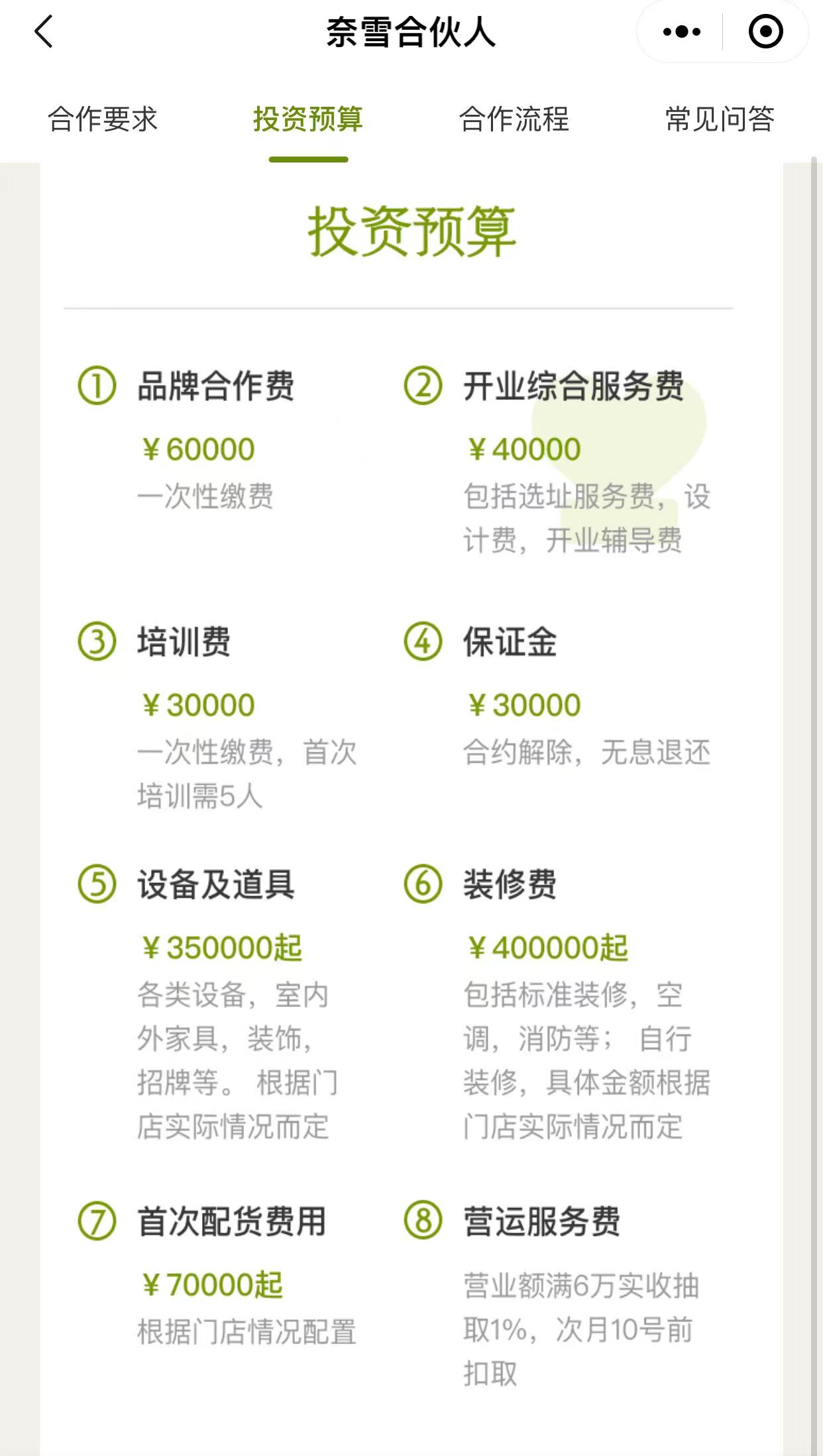从奈雪的茶公布的投资预算清单上看,包含品牌合作费、开业综合服务费、培训费、保证金、设备及道具、装修费、首次配货费用、营运服务费8大类,单店投资约100万。