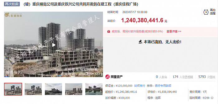 7月17日,阿里拍卖网站显示,重庆栩宽公司及重庆铁兴公司共同开发的在建工程(重庆佳程广场) 再次被挂牌,起拍价约为12.4亿元,评估价约19.38亿元,权利来源为破产拍卖。截止7月17日10时,该标的流拍。据悉,这也是该项目的第三次流拍。2022年5月13日佳程广场首次流拍,起拍价约为19.38亿元;到今年6月10日起拍价降至15.50亿元,再次流拍。此次拍卖对比第一次挂牌拍卖已直降近7亿元。