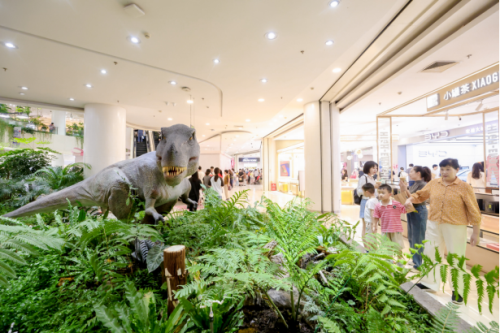 购物中心一层中庭,一只高度超过9米、置身于峡谷森林和“粉色海滩”之上的粉色恐龙骨架,将5亿年前的时空和生命美感、以及奇妙的想象力一起呈现在顾客眼前。来到不同楼层,还能发现峡谷森林深处的霸王龙、牛龙、三角龙、迅猛龙等8只“恐龙”掀起掩映的植物,或晃动身体,或发出嘶吼。这些形态逼真、装有感应装置的恐龙模型让远古大型生物从绘本和大银幕上走出来,简明扼要的文字介绍则让它们可以更好地被近距离感知和了解。