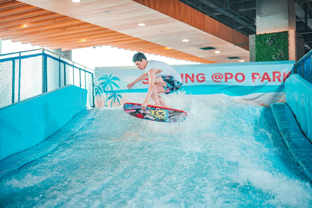 夏天与大海的搭配永不过时。针对热爱户外运动的年轻客群,今夏,购物中心最火热的清凉装备,当属于冲浪机,其往往搭配购物中心一键换装成度假模式的场景,带来“声临其境”的海边体验。