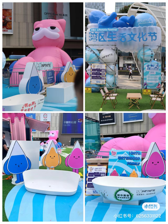 作为以融合方式推广“浴室文化”与不同文化结合的卫浴品牌,在场景布置上,iBath湾区创意市集还带来了香港品牌“INFINITE”的浴缸展示,清凉通透的浴缸空降室外,为消费者带来不一样的解暑体验。