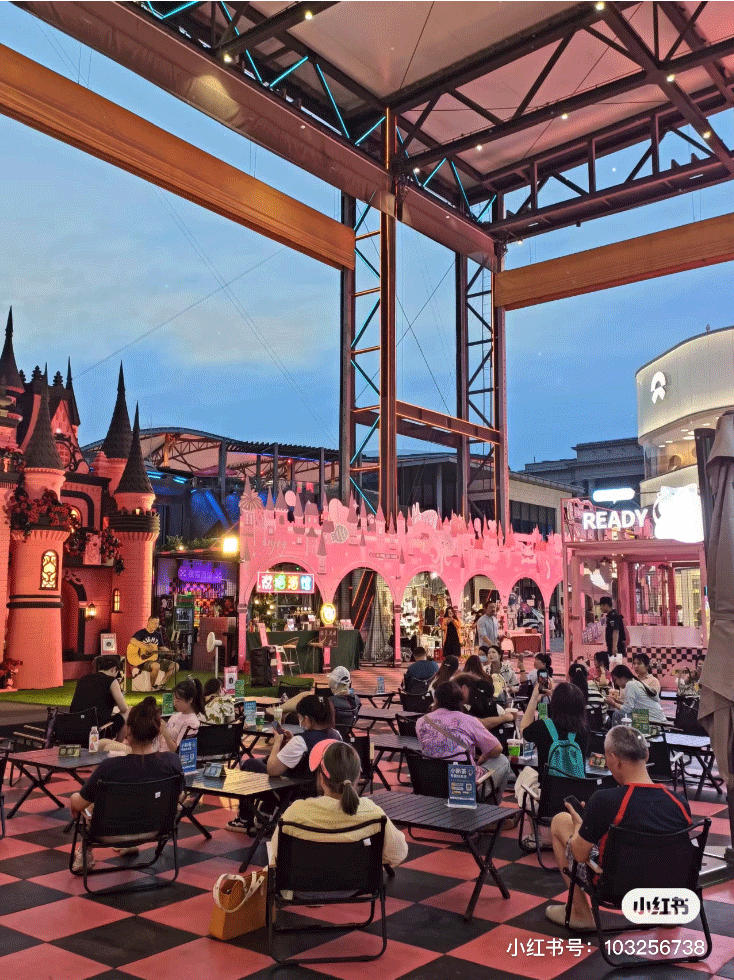 另一方面,对于户外开放式空间的拓展上,依据建筑构造,开辟更多天台外摆区或是广场,同时接入场内茶饮咖酒类商户,引导消费者去“有风的地方”。与此同时,绿植也是不可忽视的元素,通过更多有氧空间的打造制造凉意,并在户外休息空间进行大量“留白”,给消费者一个心静自然凉的放空之地。