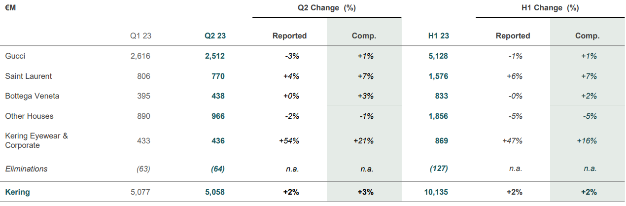 值得一提的是,开云集团刚刚发布的2023上半财年报告显示,整体业绩未能达到市场预期。集团销售总收入达到101.35亿欧元,在报告和可比基础上均录得2%的增长,低于分析师预计的6%增长;在集团旗下品牌持续投资的背景下,上半年经常性营业利润达到27亿欧元,经常性营业利润率为27.0%。