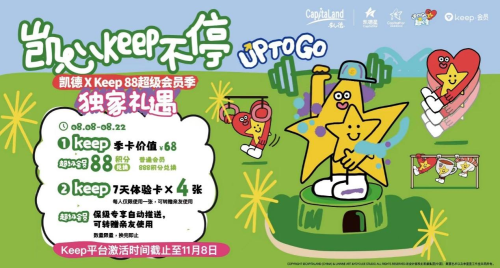 联合运动健身App——Keep,凯德推出会员限时礼遇。凯德星超级会员凭88积分、普通会员888积分,即可兑换价值68元的限量款Keep会员季卡(兑换有效期至11月8日);超级会员于活动期间保级成功,更可获得4张Keep会员7天体验卡,超级会员可使用一张,其余体验卡可以一键分享转赠亲友使用,一起凯心Keep不停。