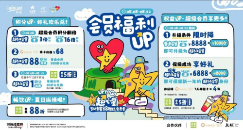 8月8日,2023凯德星88超级会员季在全国正式开启。作为凯德一年一度的宠粉节日,今年的活动以“UP TO GO”为主题,象征会员权益的全面升级。8月8日至 8月22日期间,凯德联动奈雪的茶、Keep、丸味等多家品牌合作伙伴,在全国19座城市的40余家凯德购物中心,推出力度空前的会员权益与一系列精彩纷呈的线下活动,为会员带来狂欢盛宴。