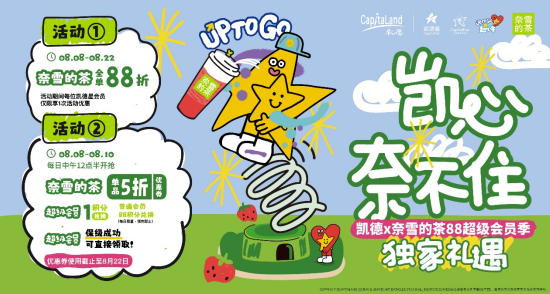 本次活动期间,凯德携手奈雪的茶送上“凯心奈不住”联合福利,并推出联名版夏日杯贴。活动期间,凯德星会员可独享三重福利。第一,每日中午12:30,超级会员凭1积分、普通会员凭88积分,即可抢兑单品5折券;第二,超级会员于活动期间保级成功,更可获取1张单品5折券;第三,凯德星会员在全国25家凯德购物中心奈雪的茶门店消费,即可享全单88折优惠,尽享秋天的第一杯奶茶。