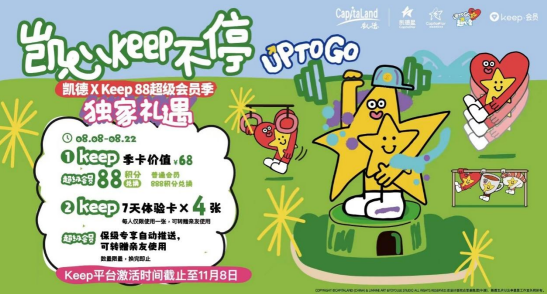 联合运动健身App——Keep,凯德推出会员限时礼遇。凯德星超级会员凭88积分、普通会员888积分,即可兑换价值68元的限量款Keep会员季卡(兑换有效期至11月8日);超级会员于活动期间保级成功,更可获得4张Keep会员7天体验卡,超级会员可使用一张,其余体验卡可以一键分享转赠亲友使用,一起凯心Keep不停。