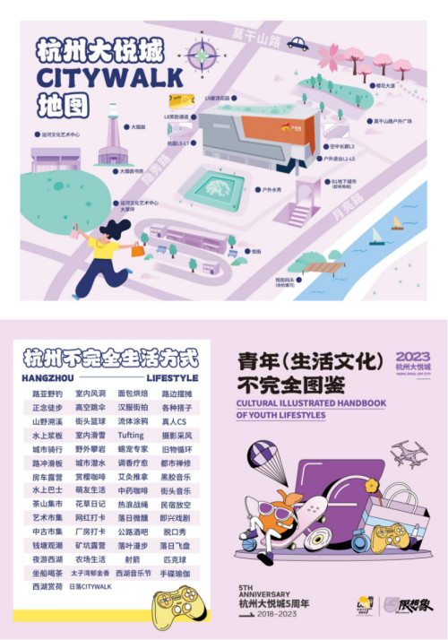 除此之外,杭州大悦城在五周年之际,还推出了自己的内容营销厂牌“热DIAN厂”杭州首个生活方式观察局,聚焦生活方式输出及原创内容发布,并于4月正式打造首条原创内容五周年年度视觉《水岸浮岛四季》,随后联动独立设计师推出五周年周边系列产品,连续发布两期热力周刊。特别值得一提的是,2023年上半年杭州大悦城深入开展客群及生活文化研究,店庆期间首次发布杭州青年生活文化不完全图鉴,提炼12大独具地域文化属性的青年画像,洞察囊括超60+生活方式。