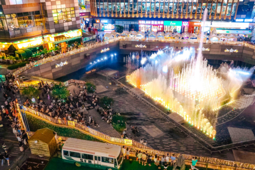 不难发现,过去五年杭州大悦城一直在探索城市青年及中产家庭理想中的生活态度和生活方式,从网红首店、业态创新、空间场景、营销活动等层面真正诠释了最初“体验式水岸潮圣购物乐园”的概念设想,逐步塑造了“酷玩无界”、“美食饕餮”“网红IP打卡”等商业标签。作为项目的亮点场景,“4D激光水秀”“烟囱广场”“艺术中心”“户外千人大草坪”“樱花小道”等,至今在杭州购物中心市场上都难得一见。