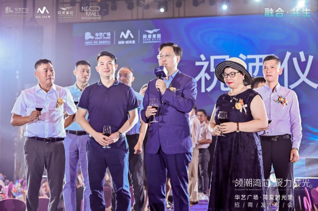 广东省连锁经营协会秘书长樊飞飞、广东省家居业联合会执行会长兼秘书长蒋德辉、中国照明协会灯具专业委员会秘书长/中山照明协会/古镇工商联/常务副主席兼秘书长区德成、华艺集团董事长区锦标、简爱集团董事长罗辑俐、东莞市连锁餐饮发展促进会常务副会长/非烤勿扰董事长朱亚明、老凤祥加盟商曾益康、中国人民政治协商会议广州市荔湾区委员会政协委员/翠华控股有限公司总裁唐一瀚、欧派集团股份有限公司营销第二事业部业务副总经理陈道品、中山市光阳游乐科技股份有限公司副总经理刘海波、1929电影公园总经理陈斌共同参与“领潮湾芯 聚力成光”华艺广场·简爱时光里招商启动仪式。
