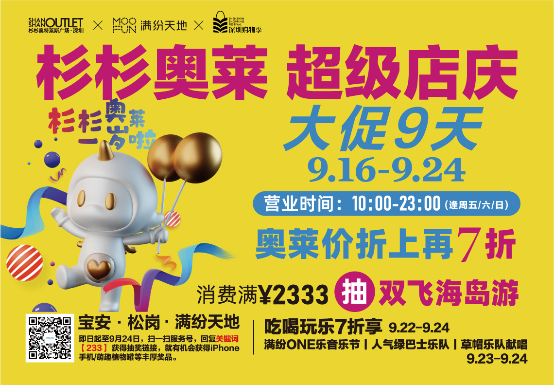 深圳杉杉奥特莱斯,愿乘长风破万里浪,特别在9月16日到9月24日的超级店庆,推出奥莱价折上再7折、抽奖赠双飞豪华海岛游、抽奖互动送萌趣植物罐等活动,全城底价、仅此9天,着力于一年仅一次的超级店庆,将海量福利集中在这9天全情奉献;致力于“聪明购物、精致生活”的理念与生活方式,让更多人、能够用更合适的价格、购买到更多大牌好物,同时还能享受理性消费带来的品质与乐趣,为美好生活持续加油!
