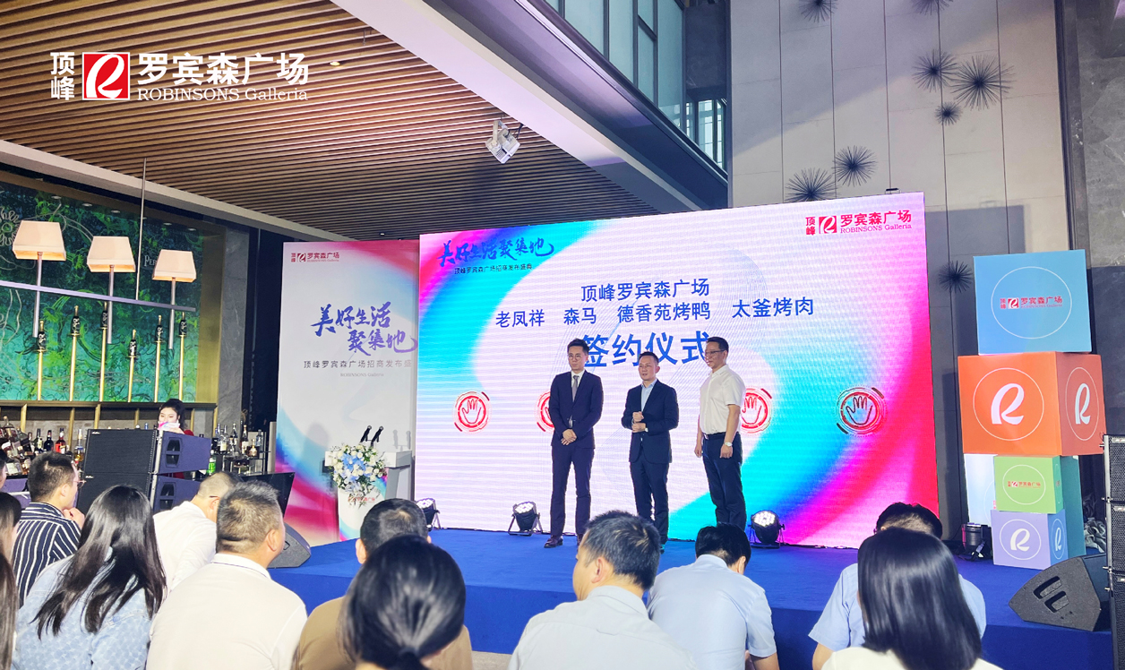 最后,盛典迎来最为重要的签约仪式环节,现场在重庆市渝中区招商促进局领导与顶峰置地中国区总经理陈国辉先生的鉴证下,由重庆罗宾森置业有限公司城市总经理罗元均先生分别与:俏巴渝·小厨先、邻里优选超市、万银横店电影城、悦纵健身、九优潮玩精品馆、以纯、华为、叁省、老凤祥、森马、德香苑烤鸭与太釜烤肉等品牌代表依次登台签约,也标志着顶峰罗宾森广场与各界品牌精诚合作的决心,预示美好生活聚集地的承诺与未来。