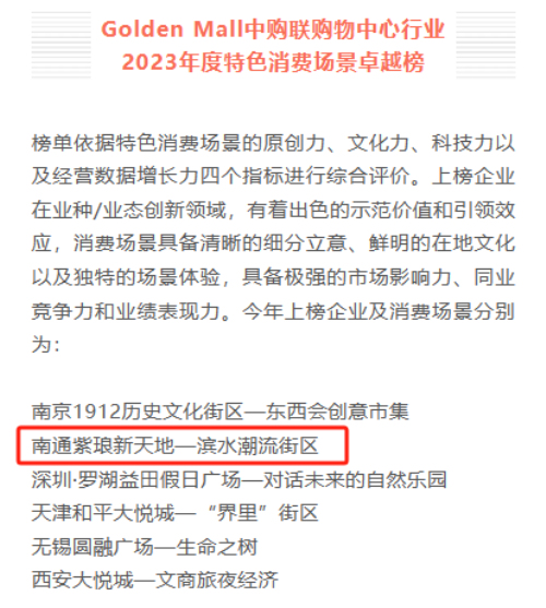 喜报!南通紫琅新天地荣登“Golden Mall中购联购物中心行业 2023年度特色消费场景卓越榜”