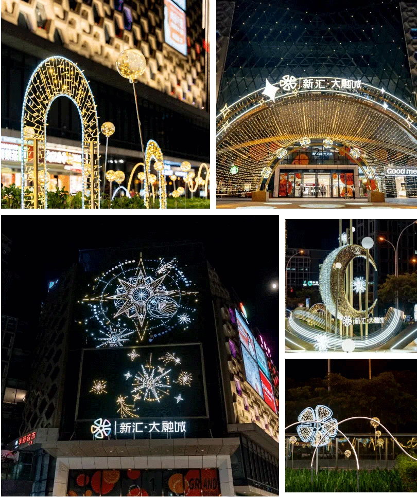 在与项目沟通过程中我们亦得知,仅9个月时间,项目硬件的修复更新多达百余项。调整之后,外立面泛光照明、室内装饰升级、导视系统及动线等都有了极为明显的改观。尤其值得一提的是,为了在其重新亮相之后迅速在大众心目中形成记忆点,项目以“簪星曳月 点亮新会”为主题,打造了星耀、曳月、星途、星迹、星台等极具IP辨识度的夜间打卡点,同时也补足整个商圈在夜经济上的氛围感。