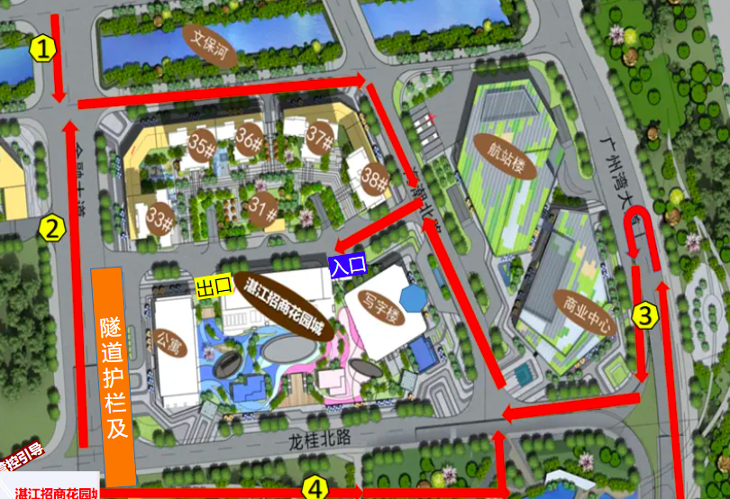 1、从金融大道赤坎方向来车从J地块文保河旁左转,沿文柏南路左转进入海潮北路然后右转进入停车场入口