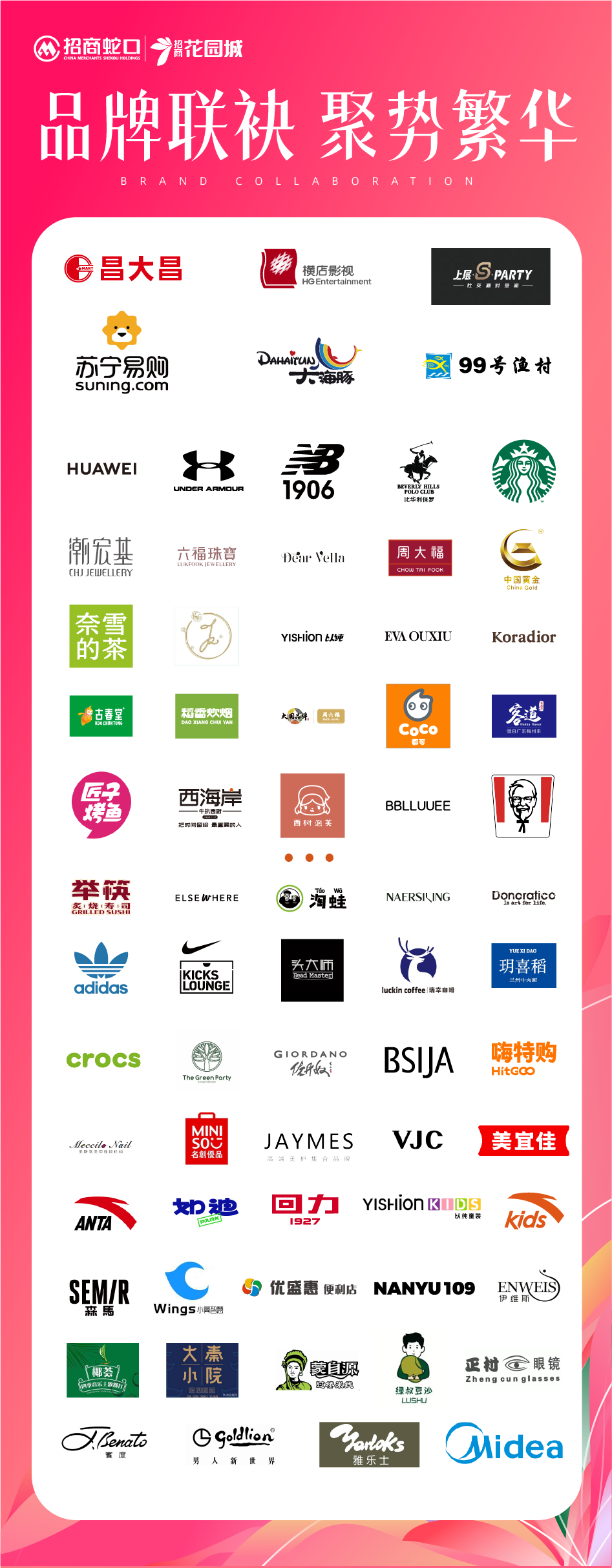 昌大昌超市、横店影城、大海豚乐园、99号渔村、上层PARTY、星巴克、肯德基、珂莱蒂尔、粉蓝、比华利保罗 、Adidas Mega、瑞幸咖啡、匠子烤鱼、六福珠宝、周大福、潮宏基、奈雪的茶、CoCo、周六福……