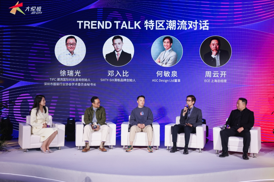 文化是升华商业空间的抓手。从在地文化、潮流文化到青年文化,从科技探索、艺术创新再到先锋时尚,深圳大悦城的商业范式是将“探索的无限可能”与“文化的丰富色彩”熔炼于商业的形态当中,从而实现“深”派生活的千人千面。此次沙龙特邀四位来自时尚艺术、潮流生活、建筑设计领域的嘉宾,开启了一场TREND TALK特区潮流对话。TIFC潮流国际时尚咨询创始人、深圳市服装行业协会学术委员会秘书长徐瑞光,SIXTY-SIX滑板品牌创始人邓入比,AGC Design Ltd董事何敏泉,ECE上海总经理周云开,共同聚焦深圳城市精神、年轻力、空间创意、时尚前景等关键词,碰撞潮流灵感,共探城市美好生活想象。