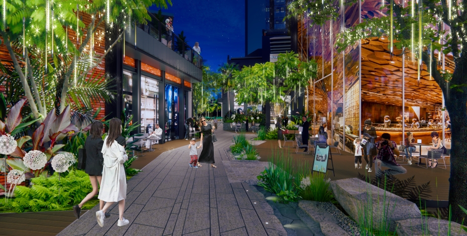 深圳大悦城在面积达4000㎡的屋顶室外空间,营造别具匠心的花境与绿植景观,结合错落蜿蜒的叠涧、溪谷、林泉的园林设计,串联两大观景平台,打造城市首个充满热带丛林意境的空中生态公园。项目在屋顶别出心裁打造十余个复式独栋盒子,以高品质的口碑餐饮和高颜值的微醺体验,营造花园里的美馔街巷漫游氛围,全时段经营演绎空中特色品味场。结合装置艺术、创意策展、沉浸体验,商业氛围与自然葱茏在这里完美交织相融,打造属于全城消费者的休闲社交新高地和深圳青年夜生活首选地。