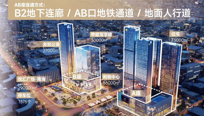 悦汇广场·南海位于佛山南海最繁华的商业地段,同时也是广佛线和佛山3号线交汇的桂城站上盖物业,周边聚集了大量的中高端品质家庭消费客群以及办公客群。项目自带TOD属性,无论是自驾、地铁、公交均能轻松抵达,为周边客群解锁轻松愉悦、自由有趣的城市生活方式。