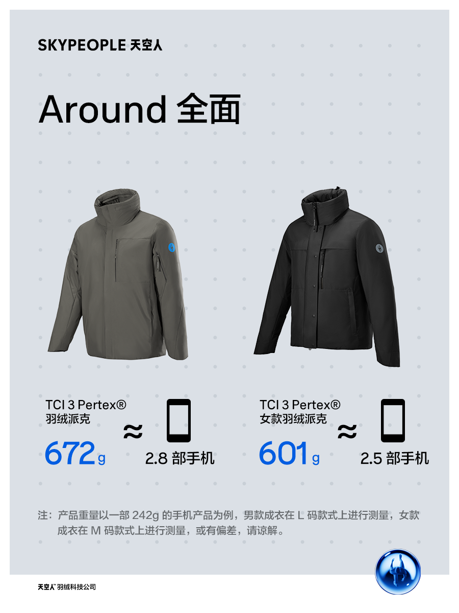 作为大热的场景,运动户外凸显着科技硬实力的价值。经过始祖鸟、Patagonia们此前的耕耘,消费者对价格的接受度提升,功能型服饰已迎来心智成熟的市场。户外风、机能风也吹向了羽绒服,SKYPEOPLE天空人的派克系列就运用科技面料,让羽绒服不仅保暖,还具备户外级防护性,同时摆脱了三合一冲锋衣的厚重,让用户轻盈出行。