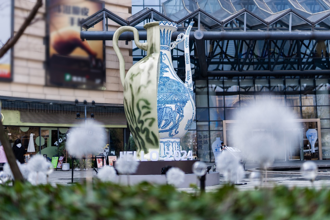 户外大型外销瓷器装置惊艳亮相,引众人驻足围观。其设计灵感源自明朝嘉靖时期景德镇窑青花喷泉纹执壶与唐朝长沙窑白釉绿彩抽象纹执壶的创意融合——两件瓷器的烧造时间相隔近900年,解构且拼接的器物直观传达跨时空的文化对话,串连起历史中丝绸之路的交流与共通,既承载着中国本土文化的情怀,又眷顾丝绸之路商贸交流所带入的审美,彰显跨越千年的城市精神。