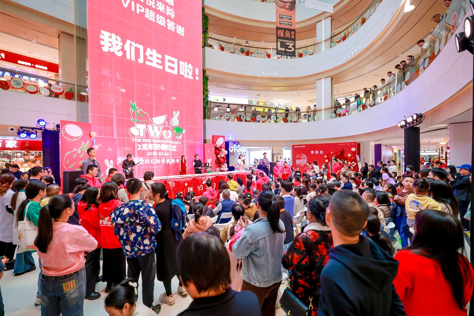 不仅如此,2周年庆期间,还开展了一系列精彩绝伦的活动,千份到店礼、火龙果大巡游、乐队表演、精彩舞台活动,好运扭蛋机、50团100 ,350团500、等人气促销活动,据统计,有效刺激消费,带动商户销售,联合品牌活动,吸引更多社区居民到场享受新消费体验。