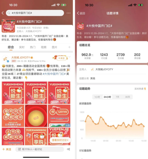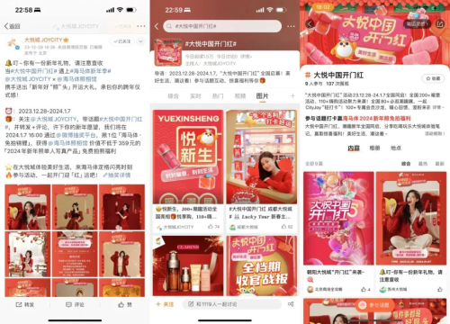 如联动「优酷」等视频平台,邀约明星艺人为大悦中国开门红录制打CALL视频进行全渠道宣发,持续扩大活动声量和传播;微博发布话题#大悦中国开门红 全方位造势,活动期间,微博话题阅读量高达962.9万,话题实时热度排名第一位;联合「支付宝」发行百万补贴、携手「京东礼品站」加大会员回馈等。