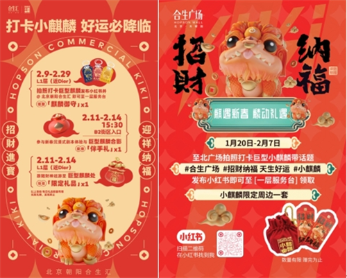 北京望京合生麒麟新天地 上线#招财纳福 天生好运#小红书话题打卡互动活动,拍照打卡巨型小麒麟,分享赢定制周边。