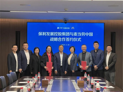 2024年2月28日,保利发展控股与麦当劳中国在广州保利发展广场签署战略合作协议。保利发展控股副总经理潘志华、保利发展控股产业中心总经理唐诗林、保利商旅公司总经理江宁琳、保利商旅公司商业事业部执行总经理杨卫东、保利发展控股产业中心常立早、麦当劳中国全国首席发展官梁海静、麦当劳中国全国联盟总经理李波、麦当劳中国全国联盟杨智坤、麦当劳中国全国联盟肖颖衡出席了本次签约仪式。