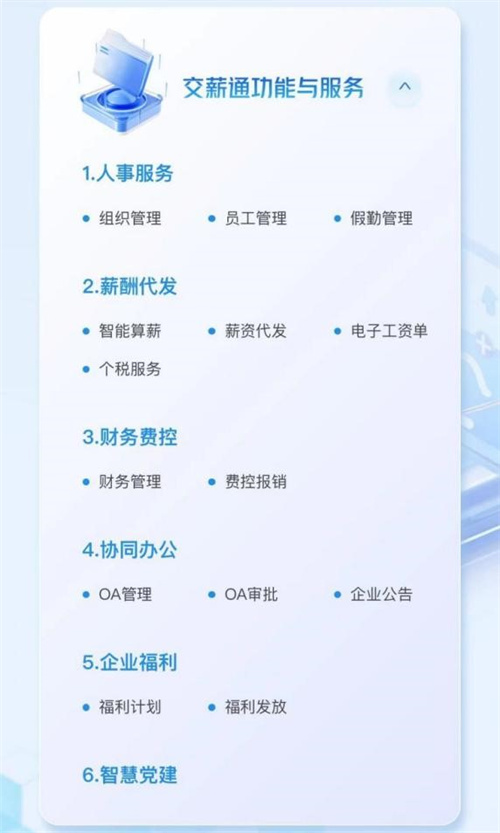 交薪通是交通银行为中小企业提供的关于薪税人事服务平台,集成“人事服务、薪酬代发、财务费控、协同办公、福利管理、智慧党建”等六大模块,免费为企业提供一站式、综合化、全方位数字化管理服务,助力企业数字化转型。